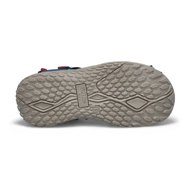 Keep their active feet comfy in the Kayla navy turquoise fisherman sandals from SoftMoc. These closed toe sandals offer up. Nubuck upper with mesh overlays, and Yogamat footbed for added comfort. The Heel strap with hook & loop closure will be perfect to adjust across little heels. The rubber outsole on these sandals gives support and traction.